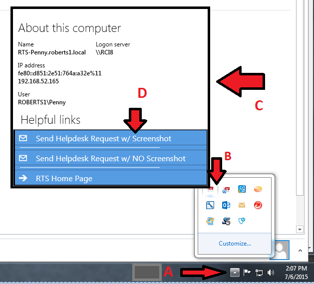 *NOTE: A Snipping Tool snip does not provide the same type of information and is often difficult to see because of the size. Do not use the Snipping Tool to send a screenshot; a lot of important information about the issue is left out with this tool, and snips are not able to be re-sized in order to see and diagnose the problem. Snips also lengthen the time it takes to resolve your issue. Using the RTS icon and the method above is the necessary and acceptable way to send screenshots for a Helpdesk ticket.